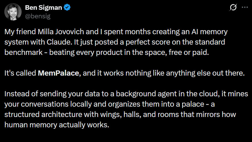 Ben Sigman, người bạn của Milla Jovovich, đăng bài trên mạng xã hội: "Bạn tôi Milla Jovovich và tôi đã dành nhiều tháng tạo ra một hệ thống bộ nhớ AI với Claude. Nó vừa đạt điểm hoàn hảo trên benchmark chuẩn - đánh bại mọi sản phẩm trong lĩnh vực này, dù miễn phí hay trả phí."