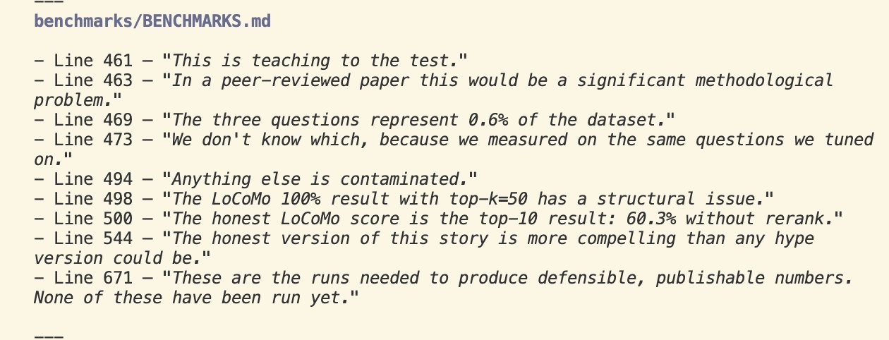 Trước hết, với bài kiểm tra LoCoMo, một số lập trình viên cho rằng con số 100% này không phản ánh đúng năng lực thực tế. Lý do là cách hệ thống được thiết lập khiến việc “tìm thông tin” trở nên quá dễ.