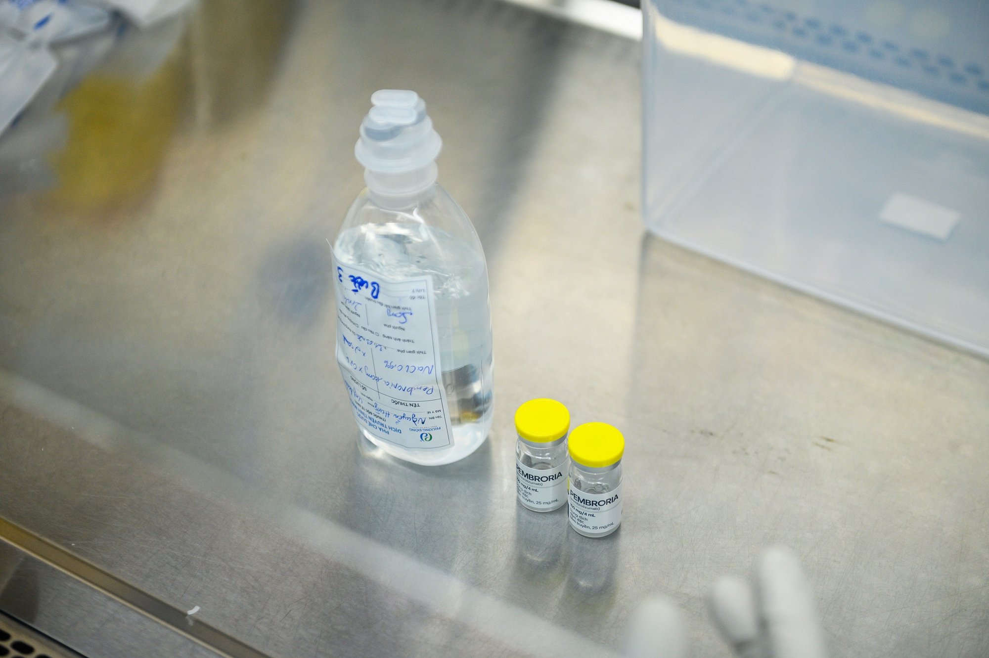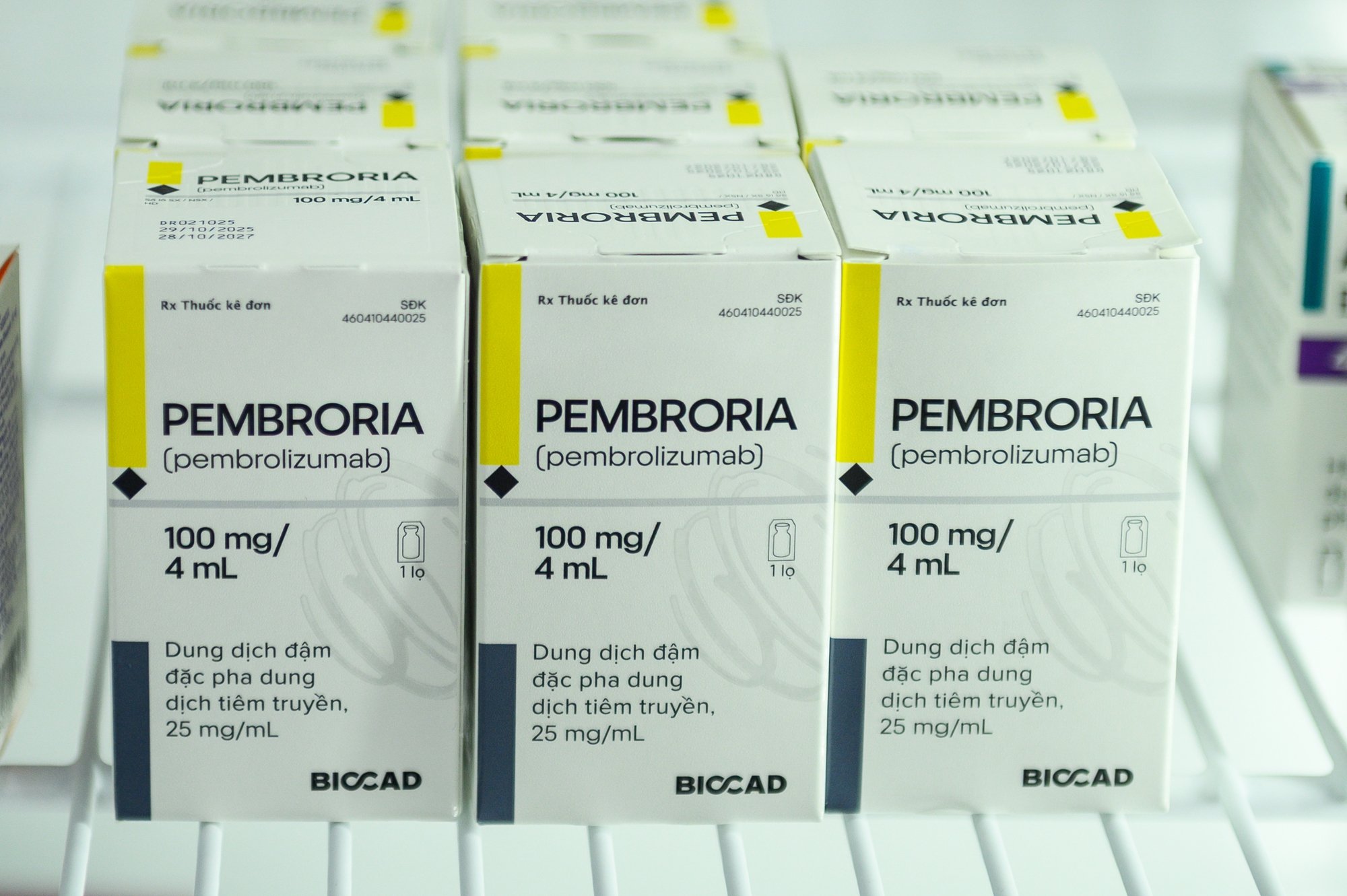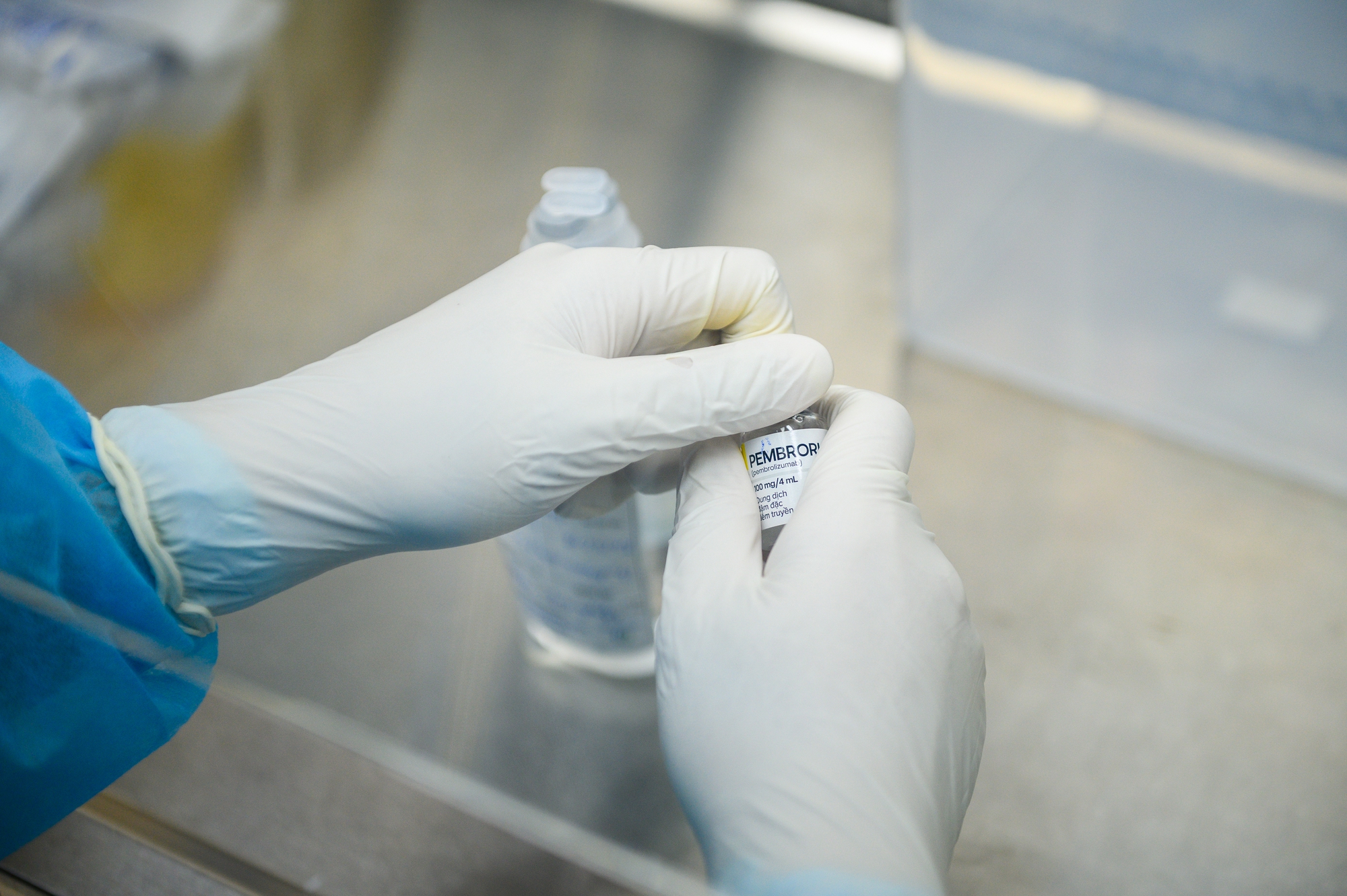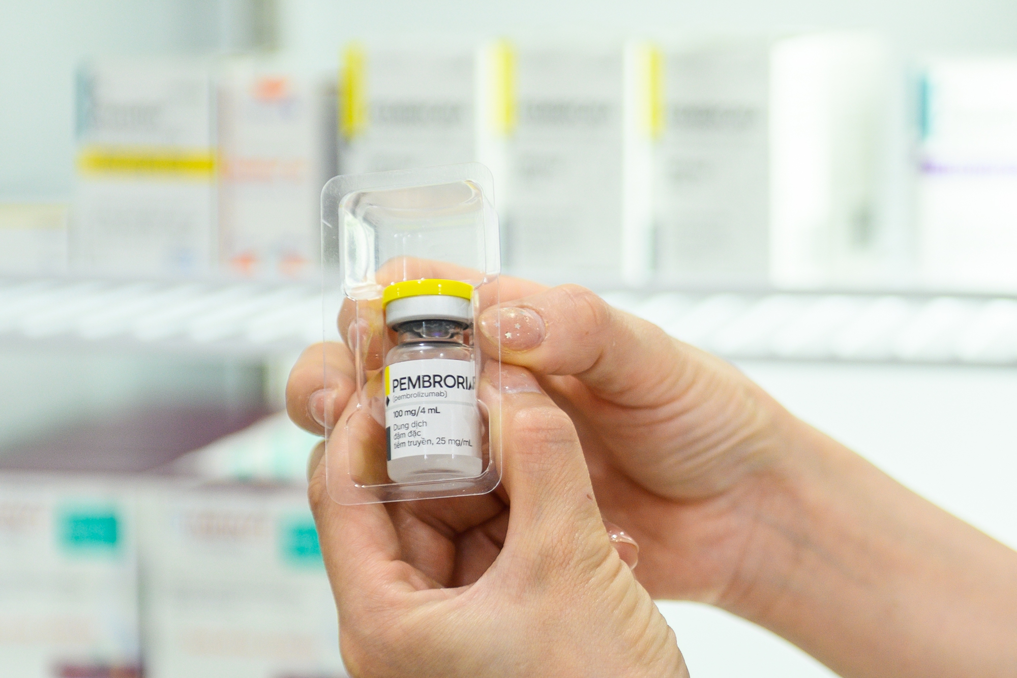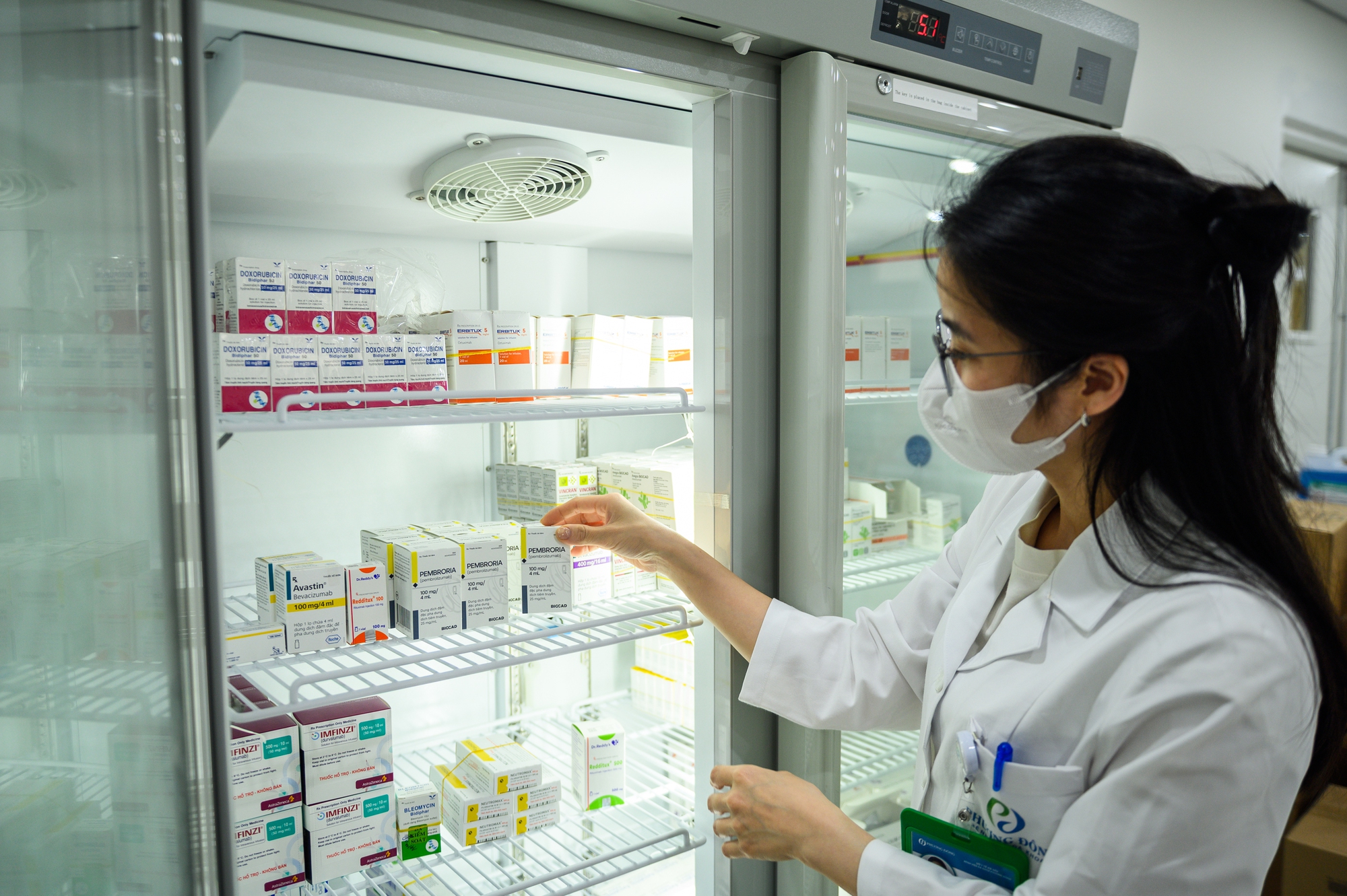 Tại kho thuốc, Pembroria được bảo quản trong tủ lạnh chuyên dụng ở 5,3 độ C, nằm trong ngưỡng bảo quản khuyến cáo từ hãng thuốc(2-8 độ C). Để được pha chế và truyền cho người bệnh, lọ thuốc này phải đi qua hàng loạt khâu kiểm soát chặt chẽ.