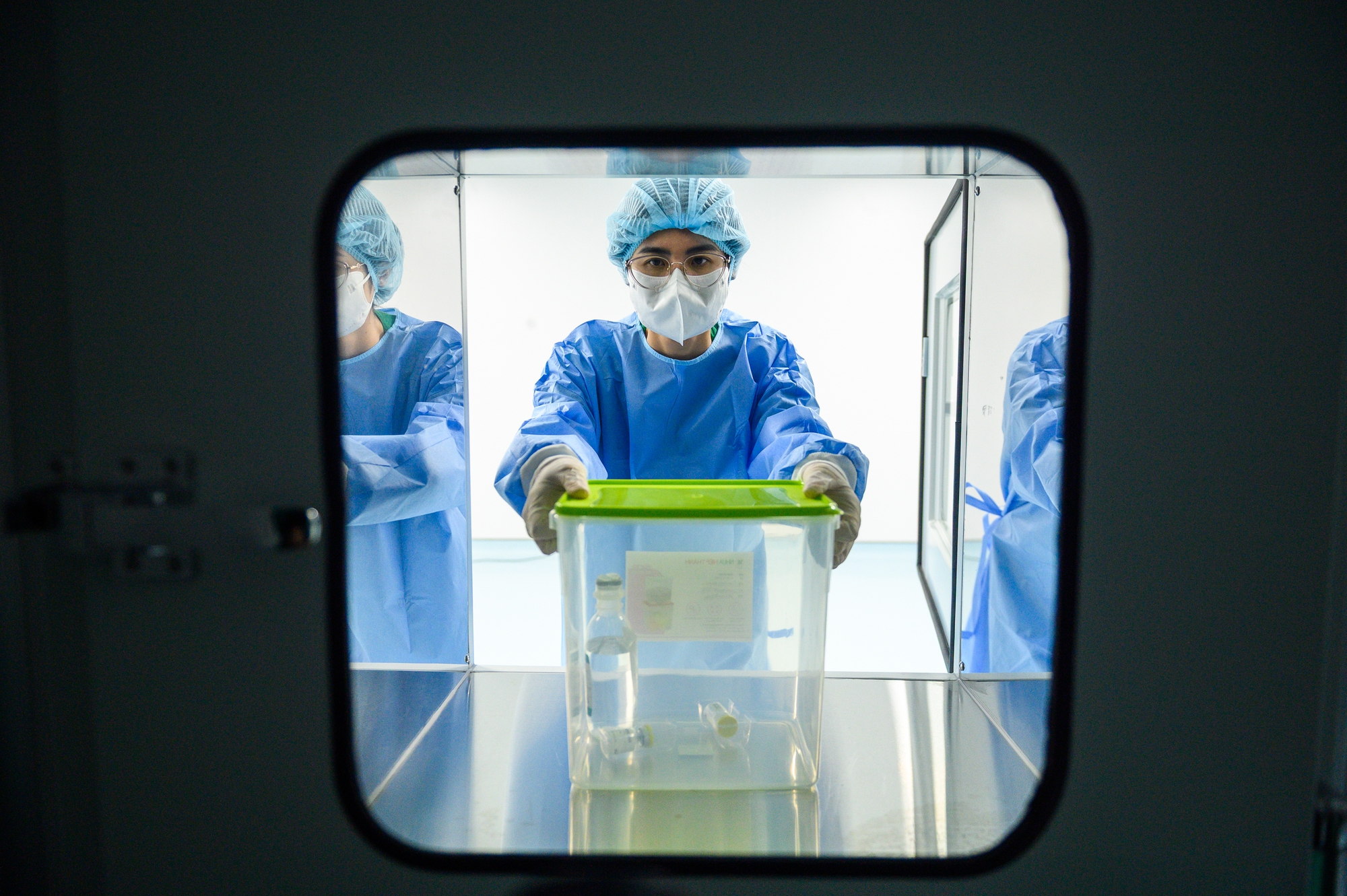 Thông qua hộc 2 chiều, hộp đựng thuốc được đưa vào bên trong.