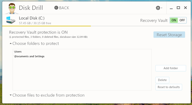 Bên cạnh chức năng phục hồi bình thường, Disk Drill còn cung cấp thêm tính năng Recovery Vault, một chức năng tương tự như System Restore ở Windows, nhưng khác ở chỗ là không chỉ làm việc được với các ổ đĩa, mà còn cả với các thư mục nữa. Recovery Vault sẽ lưu lại mọi dữ liệu về ổ đĩa hoặc thư mục mà các bạn chọn, đồng nghĩa với việc sẽ tăng khả năng phục hồi dữ liệu lên rất nhiều. Để kích hoạt, bạn hãy nhấn vào tùy chọn Protect và nhấn sang ON, sau đó lựa chọn thư mục hoặc dữ liệu bạn muốn bảo vệ.