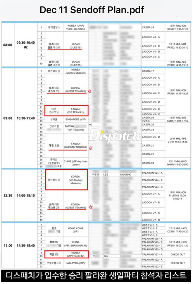 Trong danh sách, Seungri chia khách mời ra làm 2 nhóm là "khách VIP" và "khách thường", giống hệt như cách phân loại trong các hộp đêm. Những người giàu có, người nổi tiếng từ Nhật Bản, Trung Quốc, Hong Kong, Đài Loan, Singapore, Malaysia và Thái Lan đều được xếp vào hàng VIP.