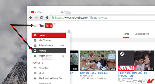 Trong giao diện Youtube, bạn hãy nhấn vào biểu tượng “3 gạch” ở kế bên logo của Youtube và nhấp vào tùy chọn History.