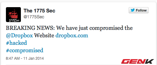 Có vẻ như Dropbox đang cố tình phủ nhận việc máy chủ của họ đã bị các hacker "hỏi thăm". Một nhóm hacker khác có tên The 1775 Sec cũng đã đăng một tweet với nội dung tương tự như các hacker của nhóm Anonymous.