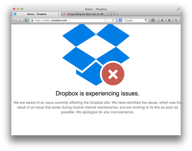 Dịch vụ sao lưu dữ liệu đám mây nổi tiếng Dropbox đang trong tình trạng "offline" và chỉ xuất hiện thông báo tới người dùng trên trang chủ. Nội dung thông báo cho biết họ nhận thức được một vấn đề hiện đang ảnh hưởng tới trang web hệ thống của Dropbox. Nguyên nhân được họ xác nhận do một vấn đề nảy sinh trong quá trình bảo trì nội bộ thường xuyên. Họ đang làm việc tích cực để khắc phục lỗi.