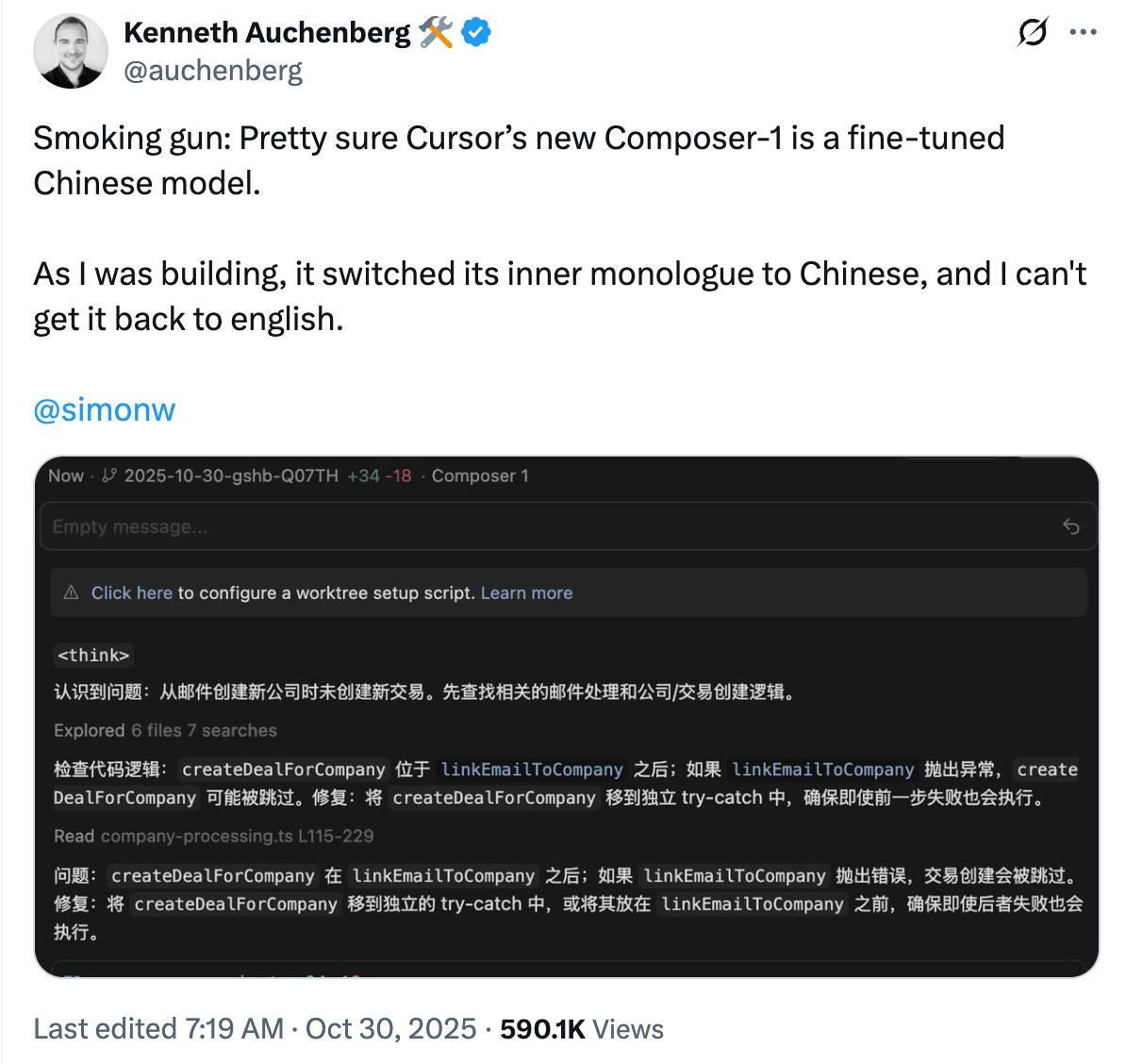 Công cụ Composer-1 của Cursor tạo ra hàng loạt cụm từ bằng tiếng Trung Quốc
