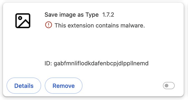 Người dùng đã cài "Save Image as Type" nên gỡ bỏ extension ngay lập tức. Các lựa chọn thay thế gồm Save Image As PNG, Save Image As JPG/PNG/WebP, và Save Image Converter - những extension hiện chưa phát hiện vấn đề bảo mật tương tự.