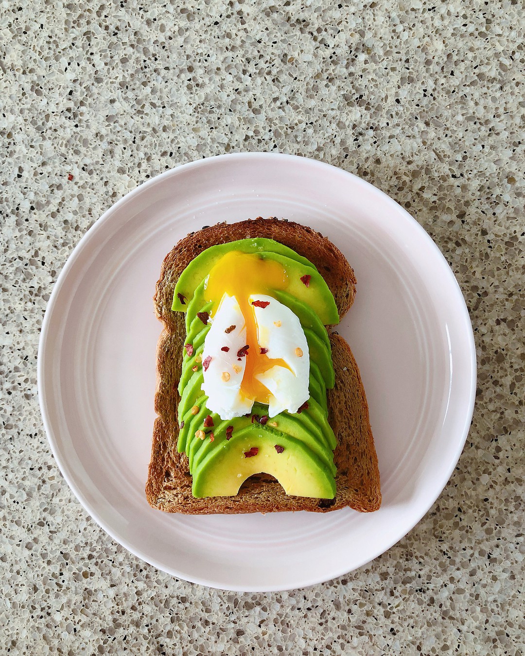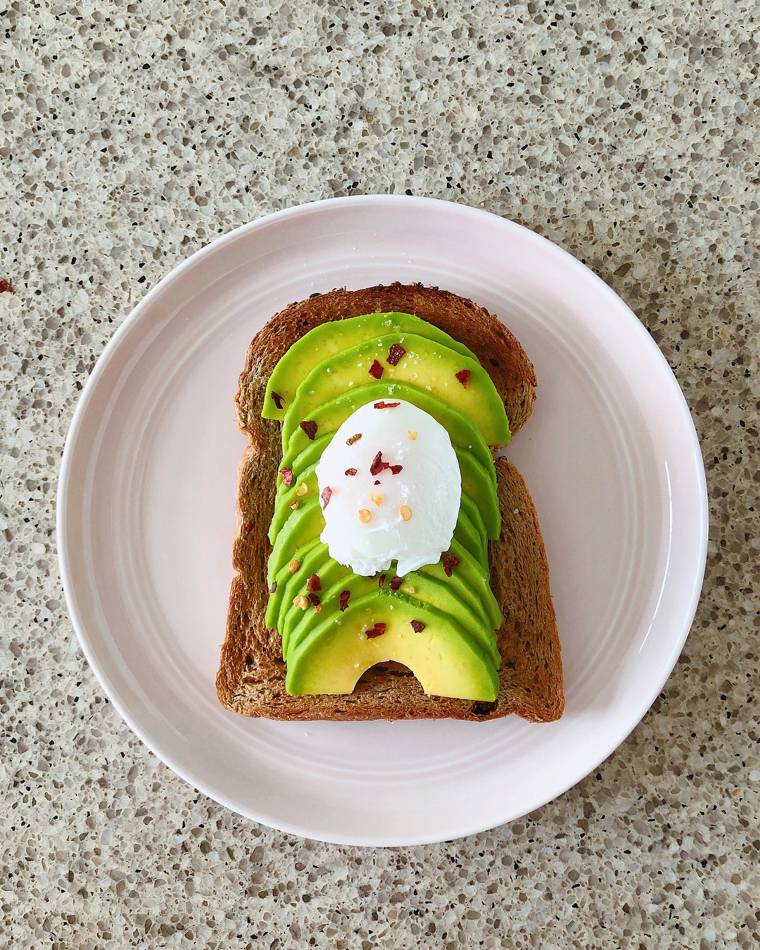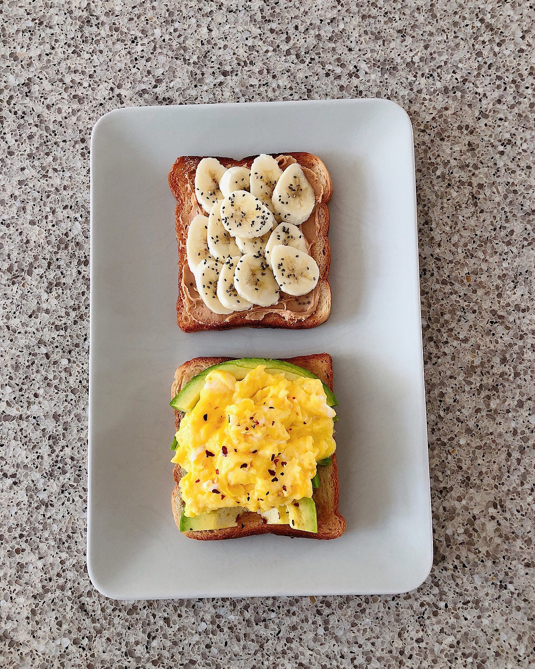 Bữa sáng của Hà Tăng khá đơn giản với bánh mỳ, bơ và trứng nướng.