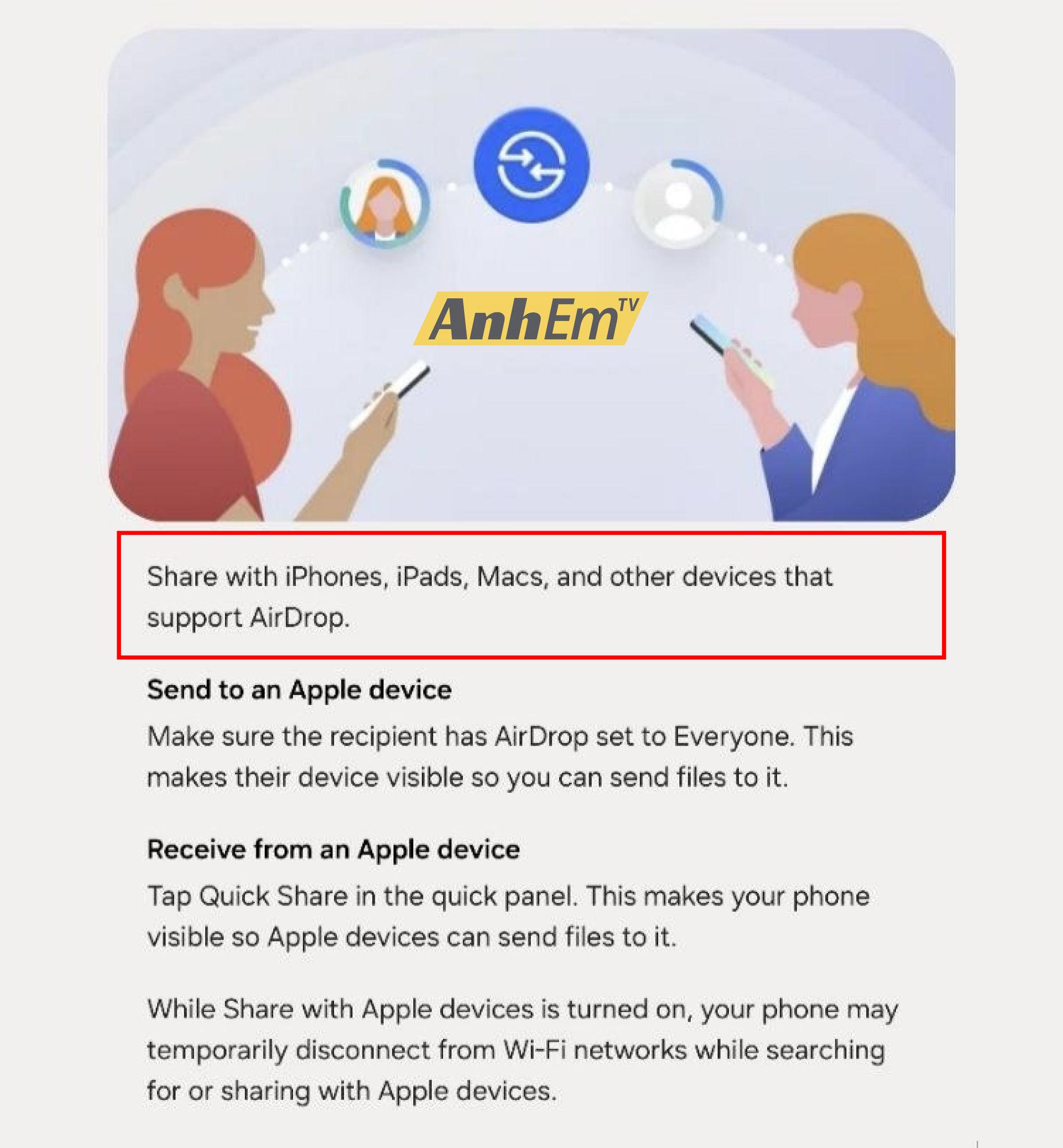 Điều kiện để tính năng hoạt động là cả hai thiết bị đều phải ở chế độ "Everyone" (hiển thị với tất cả mọi người), nhưng đây vẫn là một bước tiến lớn so với trước kia khi việc chia sẻ dữ liệu giữa Android và iOS vốn khá rắc rối.
