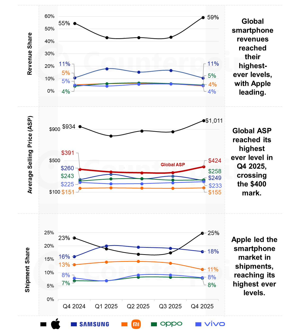 Theo phân tích của Counterpoint, Apple tiếp tục là hãng dẫn đầu thị trường smartphone toàn cầu trong năm 2025. Riêng quý 4/2025, Apple chiếm tới 57% thị phần doanh thu. Các mẫu iPhone 16 và iPhone 17, cùng nhu cầu cao tại Trung Quốc và Mỹ, đã giúp doanh thu của hãng tăng 11%, đạt 76 tỷ USD, tương đương khoảng 2.006 nghìn tỷ đồng. Đặc biệt, phiên bản Pro Max có giá cao ghi nhận sức mua rất mạnh.