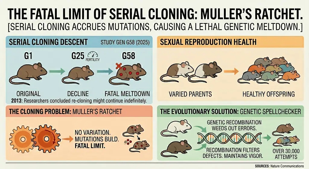 Các nhà khoa học tại đại học Yamanashi vừa phát hiện ra một giới hạn sinh học tàn khốc của tự nhiên. Sau năm mươi tám thế hệ sao chép liên tục, toàn bộ chuột nhân bản đã tử vong, chứng minh sinh sản hữu tính vô cùng quan trọng.