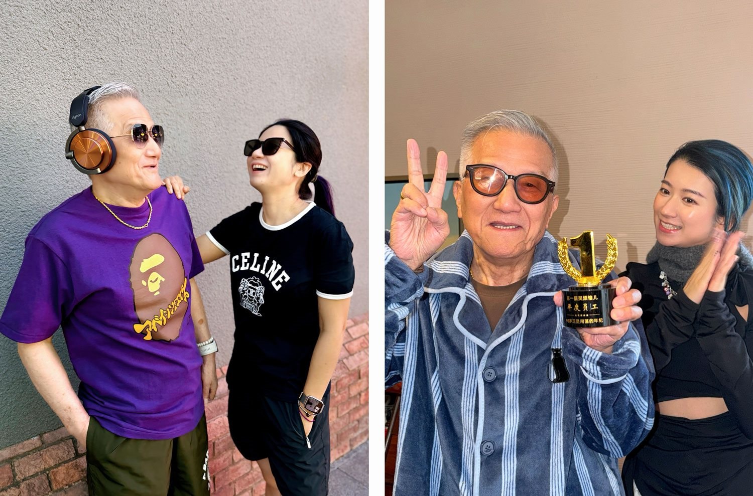 Ảnh trái: ông và mẹ của Wu chụp hình quảng cáo headphone. Ảnh phải: Wu tặng ông mình cúp giả “Nhân viên xuất sắc nhất” dựa trên đánh giá của người theo dõi.