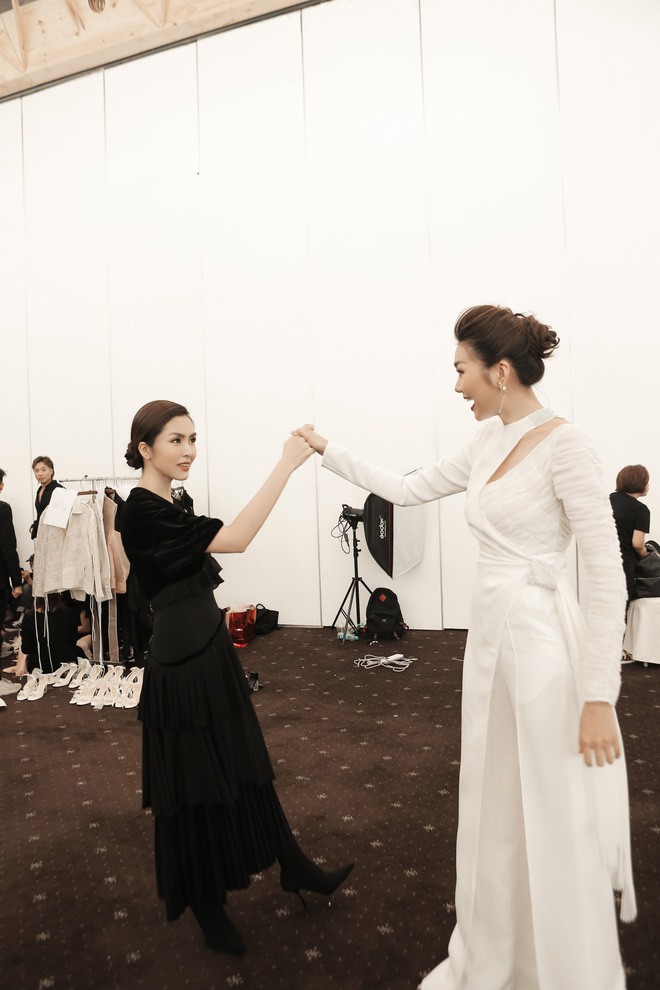 "Chị Đại" Thanh Hằng thể hiện sự ủng hộ nhiệt tình đối với Hà Tăng ngay trong cánh gà của Elle Fashion Show.