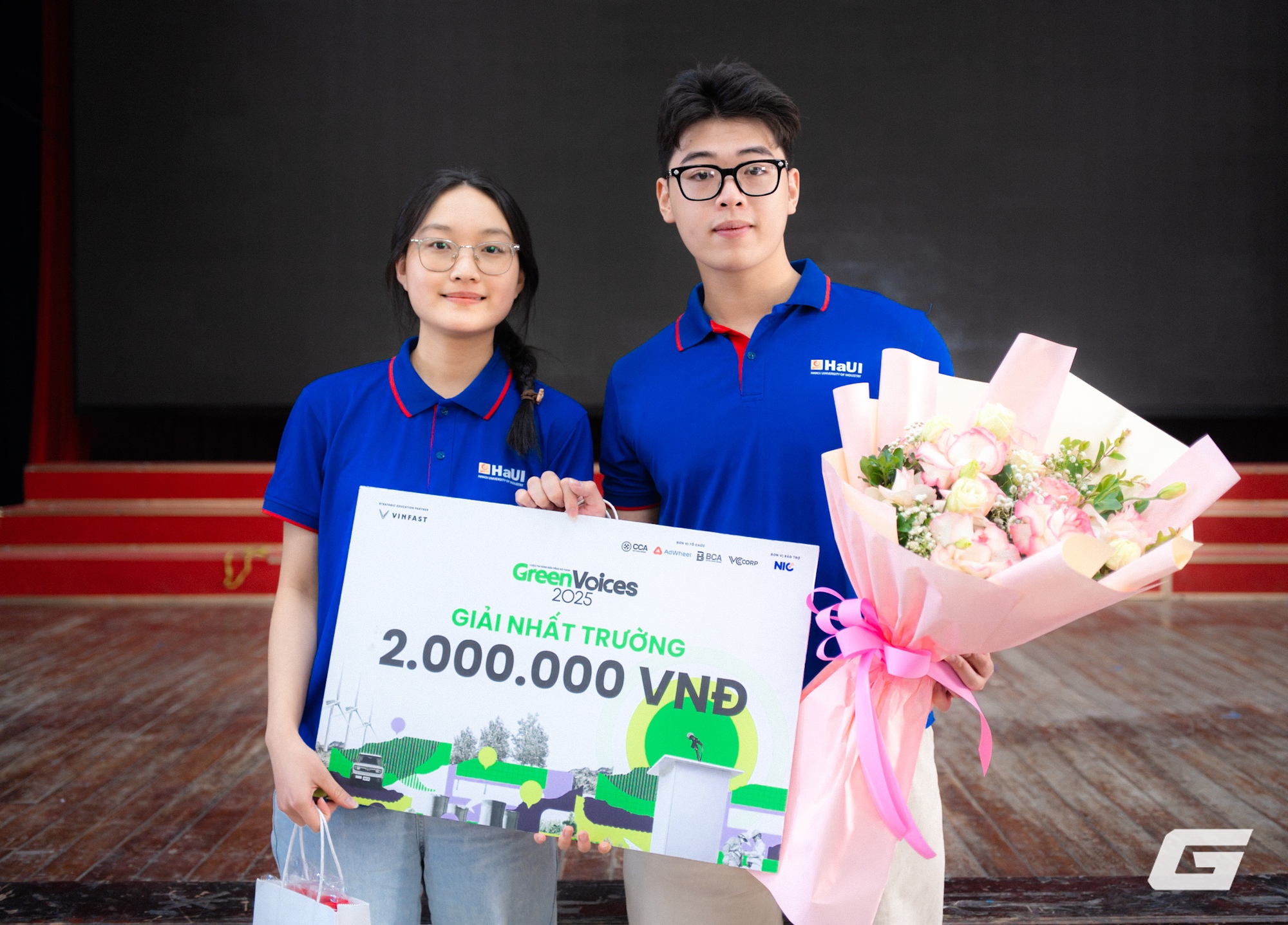 Thành Vinh và Thu Hường là Quán Quân cuộc thi Green Voices diễn ra tại Đại học Công nghiệp Hà Nội - Ảnh: Phạm Hoàng.