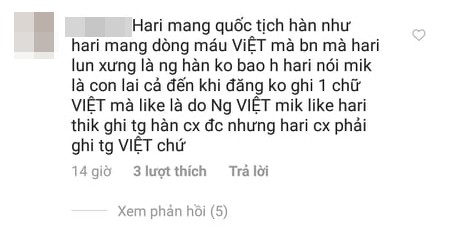 Vì thế mà không ít người đã tỏ ra khó chịu vì điều này. Họ cho rằng bố Hari là người Việt nên xét cho cùng cô vẫn là người Việt mà cô nàng lại cứ xưng là người Hàn và nói tiếng Hàn.