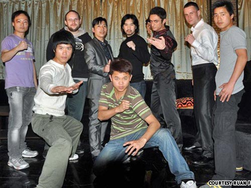 Ruan Fenghua (hàng sau, thứ ba từ trái qua) và những diễn viên đóng thế do anh huấn luyện. Ảnh: CNNGO