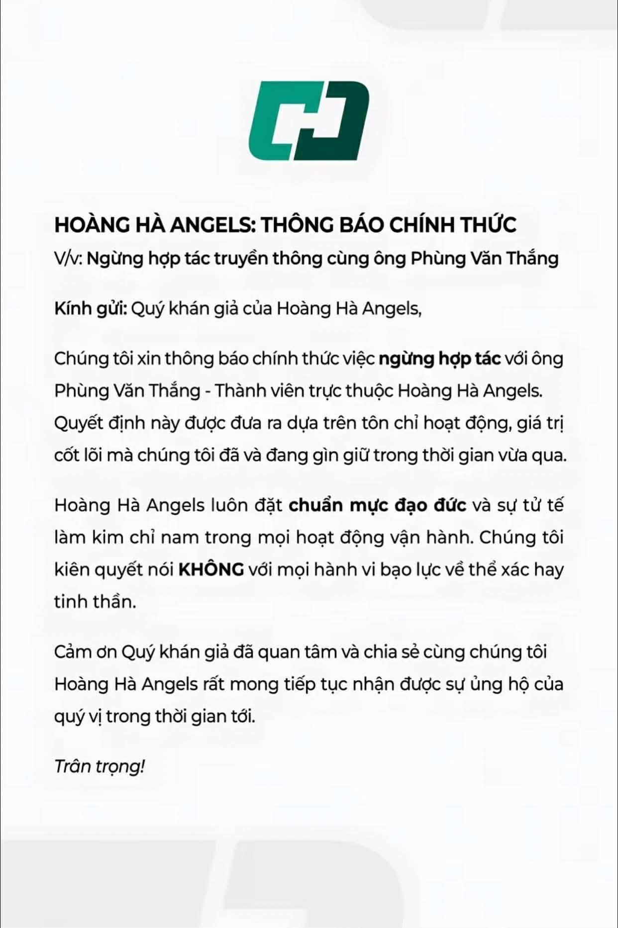 Hoàng Hà Angels luôn đặt chuẩn mực đạo đức và sự tử tế làm kim chỉ nam trong mọi hoạt động vận hành. Chúng tôi kiên quyết nói KHÔNG với mọi hành vi bạo lực về thể xác hay tinh thần", văn bản nêu.