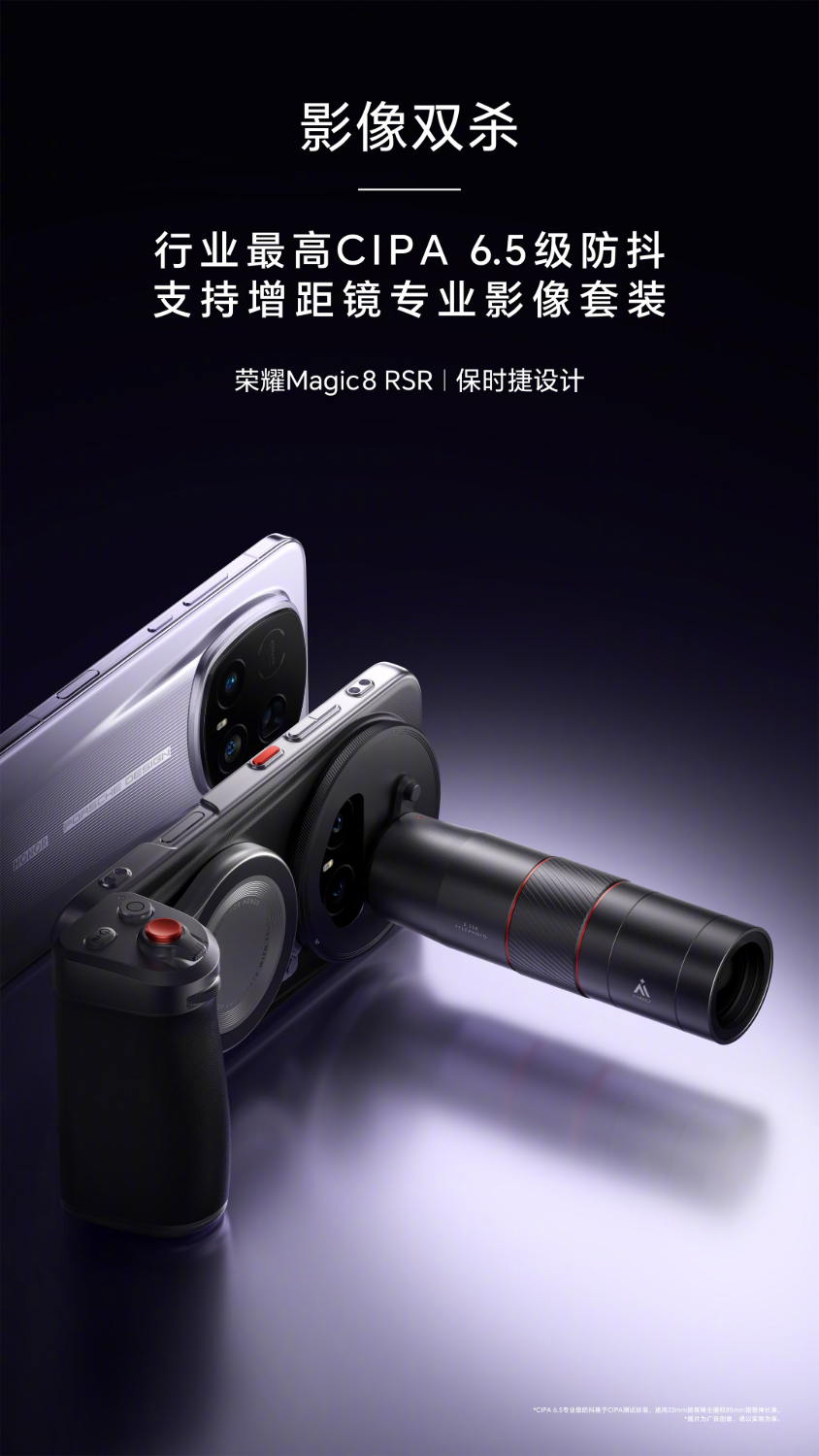 Theo teaser và thông tin đăng trên Weibo, Honor xác nhận Honor Magic 8 RSR Porsche Design sẽ có bộ phụ kiện nhiếp ảnh riêng. Điểm nhấn là mức xếp hạng ổn định hình ảnh theo chuẩn CIPA đạt 6.5, cao hơn mức 5.5 trên Magic 8 Pro. Honor cho biết việc kết hợp khả năng chống rung này với phụ kiện đi kèm giúp mở rộng đáng kể khả năng chụp ảnh trong nhiều điều kiện.