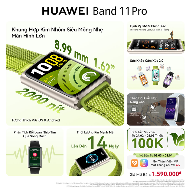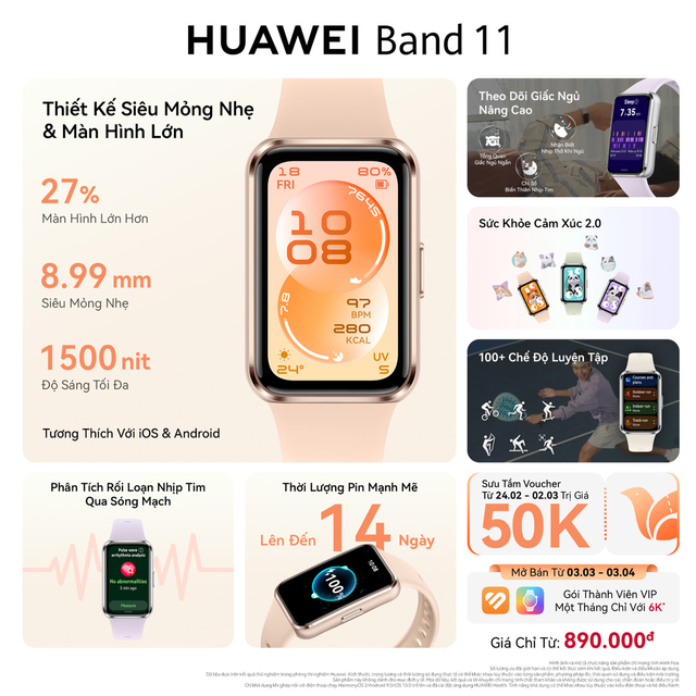 Cả hai mẫu HUAWEI Band 11 mới đều được trang bị loạt công nghệ theo dõi sức khỏe như Pulse Wave Arrhythmia Analysis giúp phân tích rối loạn nhịp tim và cảnh báo rung tâm nhĩ, cùng Sleep Breathing Awareness nhằm nhận diện bất thường trong nhịp thở khi ngủ. Thiết bị hỗ trợ hơn 100 chế độ tập luyện thể thao, đạt chuẩn kháng nước 5 ATM, kết nối Bluetooth 6.0 BLE và tương thích với Android 9.0 cũng như iOS 13.0 trở lên.