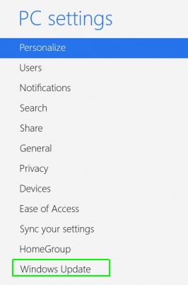 Bây giờ bạn hãy khởi động tính năng Windows update bằng cách nhấn tổ hợp phím Win C để gọi Windows Charms > Settings > Change PC settings > Windows Update