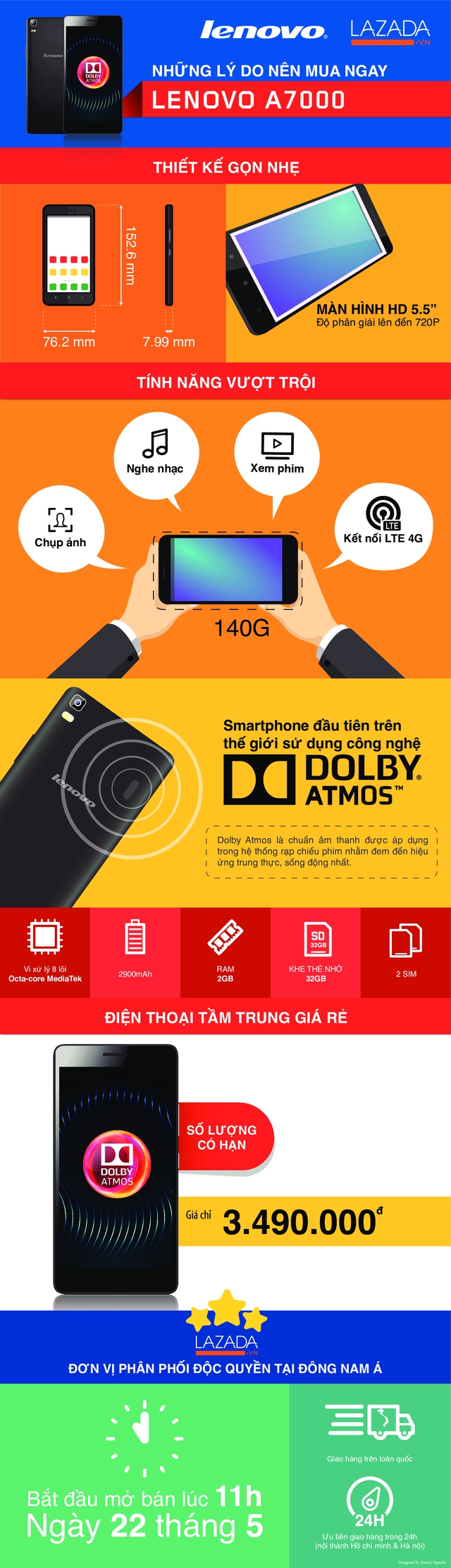 Lenovo A7000 là smartphone mới nhất của Lenovo dành cho phân khúc tầm trung tại thị trường Việt Nam. Đây là chiếc điện thoại đầu tiên trên thế giới được trang bị công nghệ âm thanh Dolby Atmos danh tiếng nhằm đáp ứng nhu cầu xem phim, nghe nhạc và đặc biệt dành riêng cho các tín đồ đam mê giải trí đa phương tiện. Dưới đây là những lý do khiến bạn không thể bỏ qua Lenovo A7000 nếu đang tìm kiếm một chiếc smartphone có thông số kỹ thuật ấn tượng với giá thành hợp lý.