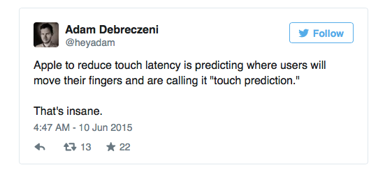 Tính năng mới này của iOS đến từ một phát hiện của... nhân viên Google - Adam Debreczeni. Anh chàng hiện đang là trưởng nhóm thiết kế ở Google này đã tìm thấy thông tin về tính năng được gọi là "touch prediction" từ những trang tài liệu dành cho lập trình viên về iOS 9: