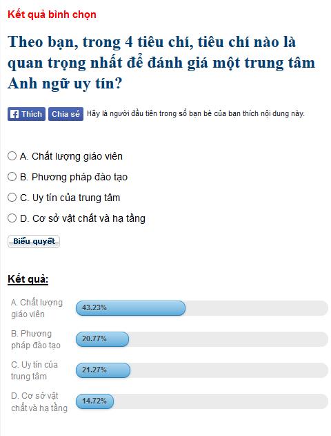 Cuộc bình chọn đã đưa ra một vài trung tâm Anh ngữ được đánh giá là uy tín tại Việt Nam hiện nay nhằm thăm dò ý kiến của độc giả về mức độ yêu thích đối với các trung tâm này. Theo đó, ILA đã giành được nhiều lượt bình chọn hơn.
