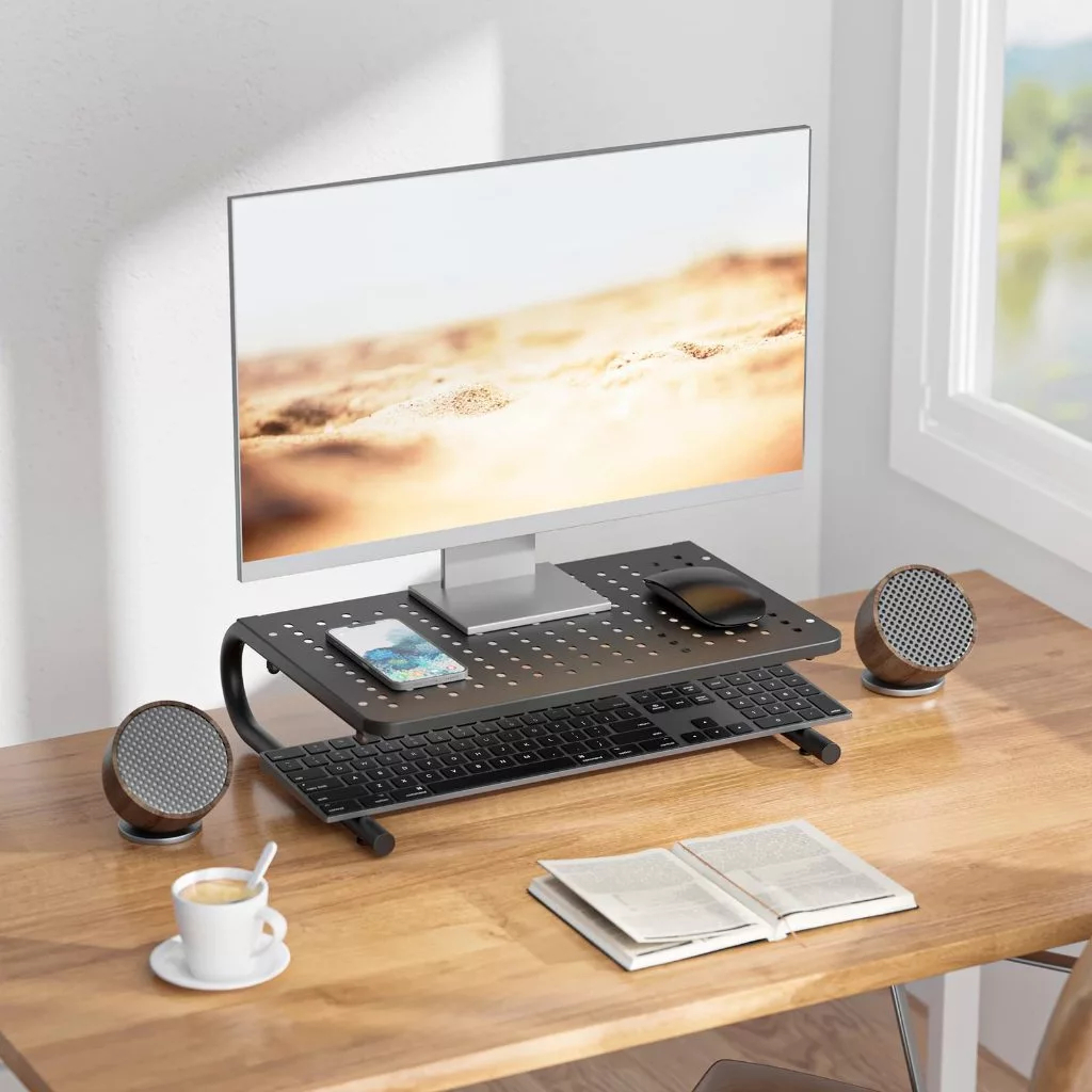 Kệ kê màn hình vừa giúp bàn làm việc gọn gàng, vừa hỗ trợ điều chỉnh tư thế ngồi đúng.