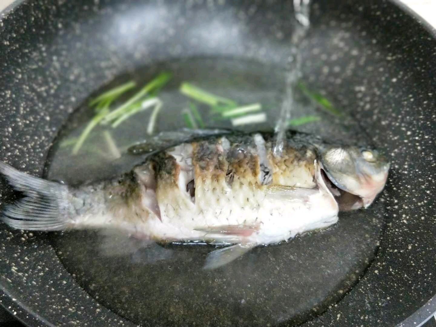 Chắt bớt dầu thừa trong chảo cá, sau đó cho thêm nước nóng và hành cắt khúc vào. Thêm 1,5 thìa cafe gia vị.
