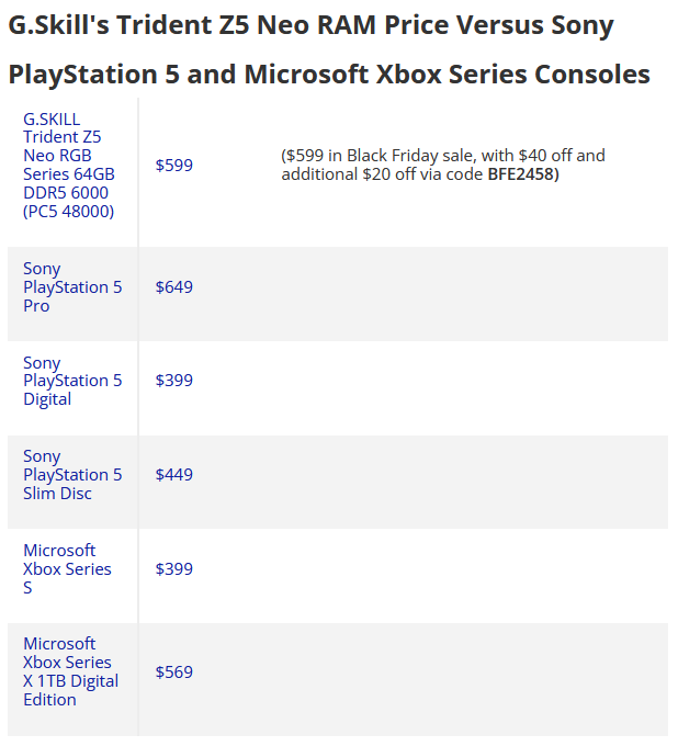 Trong mùa Black Friday khi mọi thứ đều được giảm giá, một hiện tượng nghịch lý đang khiến cộng đồng game thủ và người dùng máy tính phải ngỡ ngàng. Bộ kit RAM DDR5 64GB của G.Skill Trident Z5 Neo với tốc độ 6000 MT/s hiện đang được niêm yết với giá 599.,99 USD trên Newegg, đắt hơn tới 200 USD so với PS5 Slim hoặc Xbox Series S, và chỉ rẻ hơn 50 USD so với phiên bản PS5 Pro cao cấp nhất.