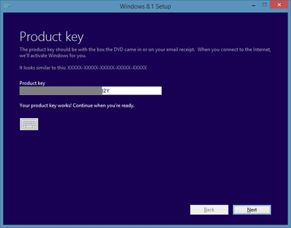 Màn hình kế đến xuất hiện, bạn điền khóa bản quyền vào và nhấn Next. Nếu quên khóa bản quyền, bạn có thể sử dụng công cụ Windows Product Key Finder Pro để tìm lại