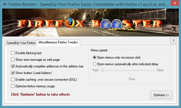 Firefox Booster là công cụ nhỏ gọn và miễn phí, cho phép tự động tối ưu các thiết lập trên Firefox, để giúp trình duyệt web này hoạt động mượt mà và nhanh chóng hơn, để phù hợp với đường dây kết nối Internet mà máy tính bạn đang sử dụng.