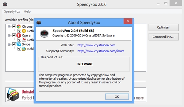 SpeedyFox là tiện ích miễn phí khắc phục vấn đề này chỉ với một cú nhấp chuột. Sau khi tối ưu Firefox với tiện ích nhỏ gọn này, bạn sẽ cảm thấy Firefox sẽ trở nên nhẹ nhàng, thời gian khởi động nhanh và không còn chiếm dụng nhiều bộ nhớ khiến ảnh hưởng nhiều đến hệ thống như trước đây. Tốc độ hoạt động của Firefox sẽ nhanh hơn gấp 3 lần so với trước đây.