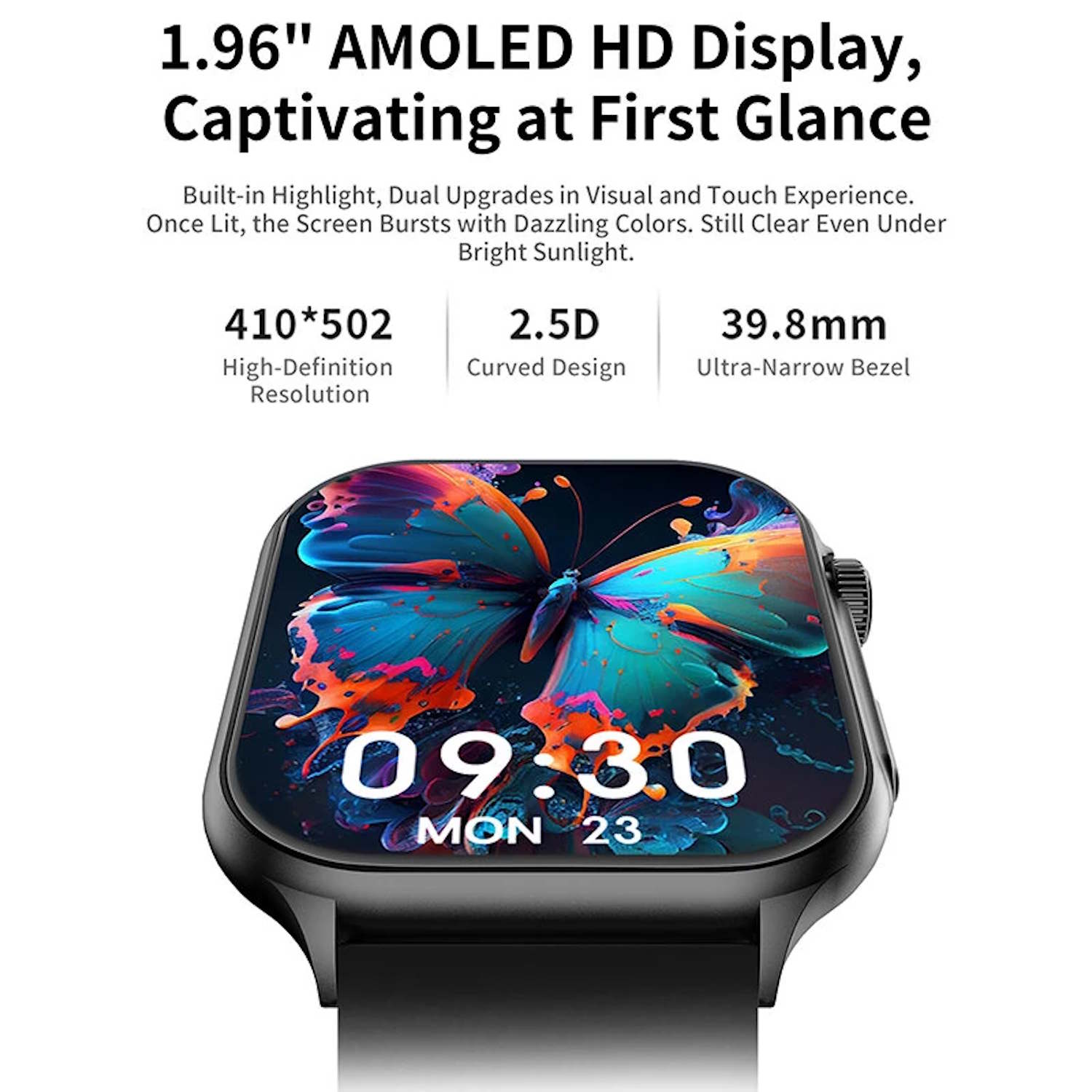 Thiết bị sở hữu màn hình AMOLED kích thước 1.96 inch, độ phân giải 410 x 502 pixel, viền bo tròn ở các cạnh nhằm cải thiện cảm giác sử dụng khi thao tác.