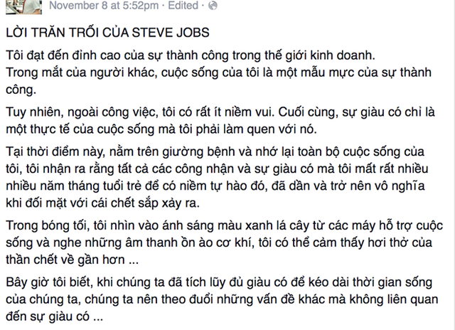 Cuối tuần qua, bài đăng từ Facebook của Nguyễn Hoàng Hải, một người hoạt động trong lĩnh vực truyền thông ở Hà Nội đã nhận được khoảng 18.500 lượt thích và hơn 13.000 lượt chia sẻ. Bài viết có tiêu đề "Lời trăn trối của Steve Jobs", đưa ra lời khuyên cho những ai làm giàu không ngừng mà bỏ bê sức khoẻ và hạnh phúc.