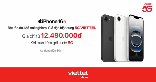 Từ ngày 1/11 đến 31/12/2025, người dùng có thể mua iPhone 16e với mức giá ưu đãi khi đăng ký kèm gói cước 5G Viettel, với tổng giá trị giảm giá tối đa khoảng 4,5 triệu đồng tùy gói cam kết và dung lượng bộ nhớ.