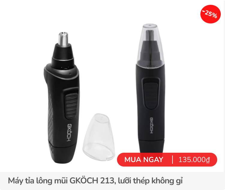 Đầu tiên, bạn có thể tham khảo máy tỉa lông mũi GKÖCH 213. Máy sử dụng lưỡi thép không gỉ, chạy bằng pin AA, ưu điểm là cắt êm, không giật lông, thao tác đơn giản. Đây là lựa chọn hợp lý cho người muốn chuyển từ kéo sang máy điện.