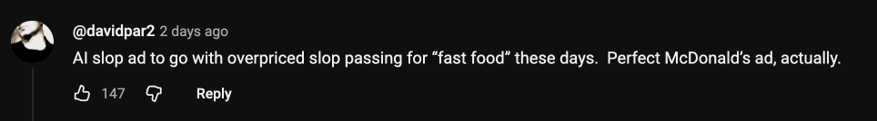 Một người khác so sánh sự "tạp nham" - "slop" của video AI này giống với các loại đồ ăn nhanh - thứ mà McDonald's bán.