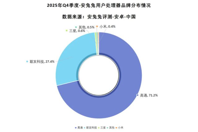 Dữ liệu từ AnTuTu quý 4 cho thấy Qualcomm chiếm 71,2% thị phần vi xử lý Android, trong khi MediaTek đứng thứ hai với sự thống trị ở phân khúc điện thoại tầm trung.