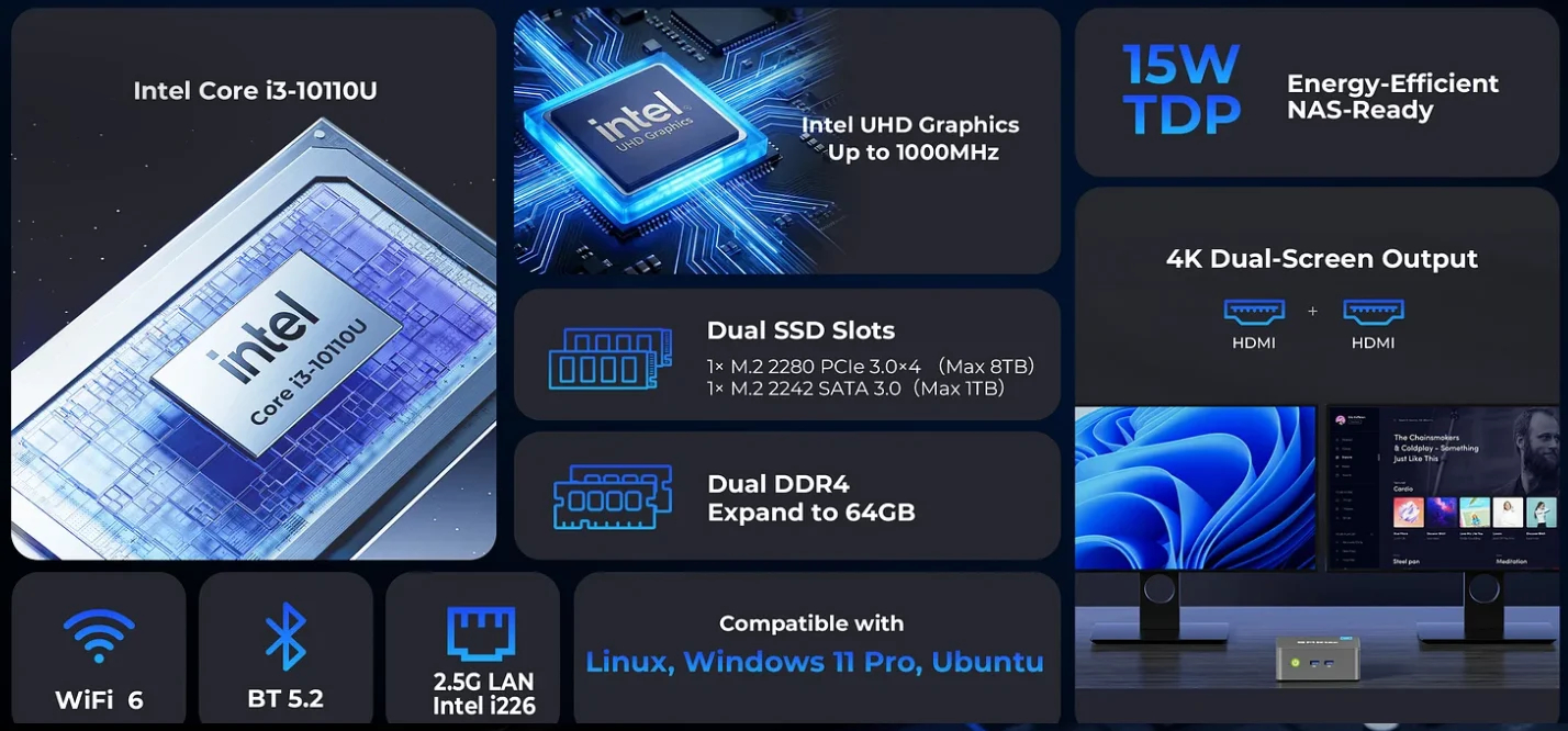 Mẫu mini PC NucBox G3 Pro được bán toàn cầu với cấu hình Intel Core i3-10110U, 2 khe RAM DDR4 tối đa 64GB, 2 khe M.2 và LAN 2.5G, hướng đến nhu cầu làm việc, giải trí và máy chủ gia đình.