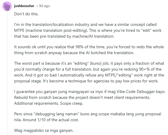 Những lời cảnh báo này không phải vô căn cứ. Một người làm trong ngành dịch thuật đã chia sẻ kinh nghiệm tương tự với công việc "chỉnh sửa bản dịch máy". "Nghe có vẻ ổn cho đến khi bạn nhận ra rằng 98% trường hợp, bạn buộc phải làm lại từ đầu vì AI dịch sai. Phần tồi tệ nhất là vì đó là công việc 'chỉnh sửa' nên giá chỉ bằng một phần mười so với dịch thật, nhưng bạn lại phải làm lại 90% công việc," anh này viết.