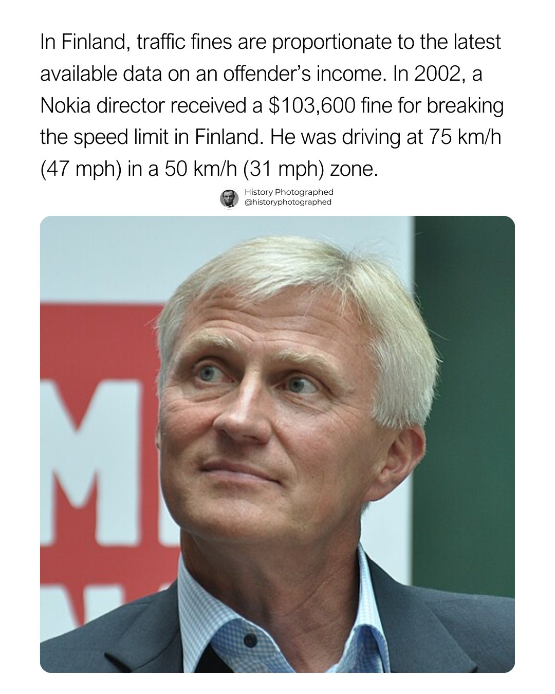 Một vụ phạt giao thông tại Phần Lan năm 2002 từng gây chú ý khi một lãnh đạo của Nokia phải nộp số tiền tương đương khoảng 1.6 tỷ đồng vì chạy quá tốc độ. Nguyên nhân nằm ở cách tính tiền phạt đặc biệt của quốc gia này, nơi mức phạt được xác định dựa trên thu nhập của người vi phạm.