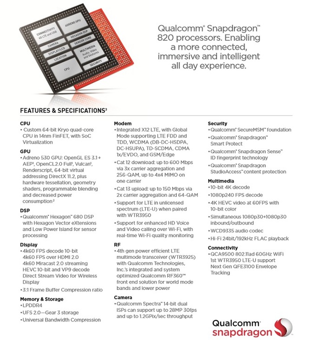 Qualcomm đã chính thức công bố con chip quad-core mới nhất là Snapdragon 820. Snapdragon 820 được sản xuất dựa trên quy trình 14nm. Hiện, Galaxy S7 và một thiết bị Lumia đang được đồn đoán là sẽ được trang bị con chip mạnh nhất của Qualcomm. Giới công nghệ cho rằng chip xử lý này cũng sẽ xuất hiện trong một smartphone Nexus 2016, một lần nữa là do Huawei (Trung Quốc) sản xuất.