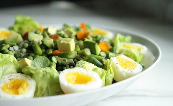 Thải độc cơ thể với món salad xanh: nguyên liệu chính là măng tây, rau xanh, đậu hà lan, quả bơ, hẹ, lá bạc hà trộn cùng dầu oliu, muối và hạt tiêu bổ sung chất xơ, vitamin C, E giúp thanh lọc cơ thể, loại bỏ độc tố.
