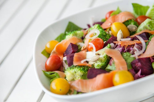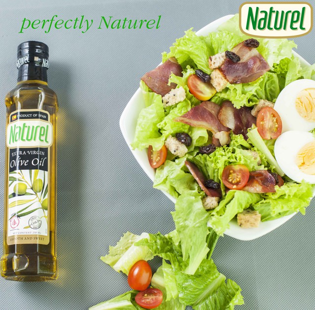 Cách làm: cá hồi xông khói thái lát mỏng. Bông cải xanh , củ cải đỏ, cà chua bi, hành tím, salad romaine rửa sạch để ráo nước trộn cùng sốt từ dầu oliu của Naturel và nước cốt chanh kèm thêm 1 chút muối, tiêu. Bạn có thể thêm các loại hạt khô như hướng dương, hạt điều, óc chó… tăng hương vị cho món salad này.