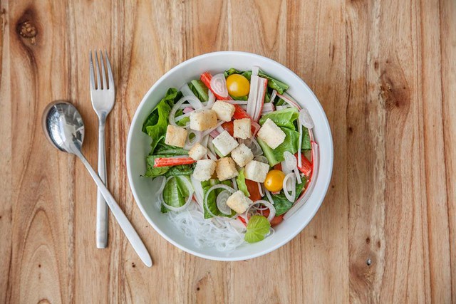 Trải nghiệm mới với salad cùng miến gạo: Với salad búp, thanh cua, miến gạo, cà chua bi, bánh mì nướng kèm sốt chanh sả kiểu Thái, cùng một muỗng dầu oliu.