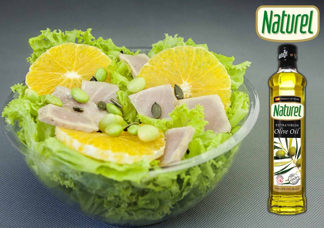 Cách làm: Rau xanh để ráo nước, cắt thành từng đoạn khoảng 3cm. Cà chua bi cắt đôi ,cam navy lột vỏ, cắt khoảng 3 lát tròn. Cá ngừ sống áp chảo 2 mặt. Trộn các nguyên liệu đã chuẩn bị với nước sốt dầu oliu của Naturel, giấm táo, một chút muối.