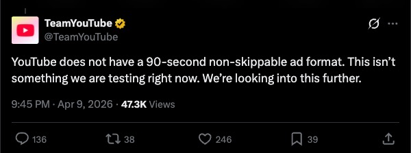 Phản hồi lại tài khoản Dexerto trên nền tảng X về vấn đề này, đại diện Team YouTube khẳng định ứng dụng của họ hiện không sử dụng các đoạn quảng cáo 90 giây không thể bỏ qua, đồng thời cũng không tiến hành bất kỳ đợt thử nghiệm nào cho định dạng này.