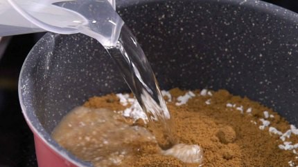 Cho bột khoai tây, đường đen và nước vào nồi. Trộn đều hỗn hợp này.