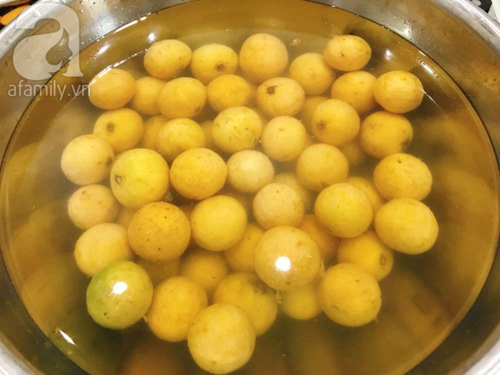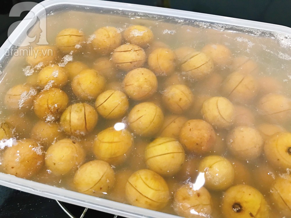 Sấu chọn quả tròn, to đều. Sau đó cạo sạch vỏ ngâm vào chậu nước muối pha loãng để loại bỏ vị chát và chống thâm.